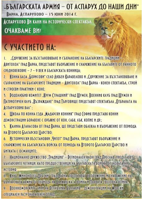 За втора поредна година, по инициатива на Район Аспарухово при Община Варна, бе представен историческият спектакъл „БЪЛГАРСКАТА АРМИЯ - ОТ АСПАРУХ ДО НАШИ ДНИ”, организиран от „Сдружение за възстановяване и съхранение на българските традиции - Авитохол” град Варна.